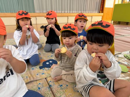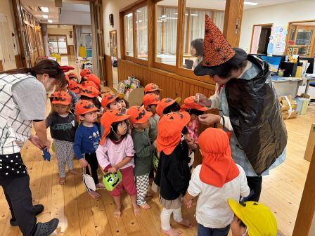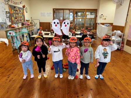 次回はわらべうたベビーマッサージ・作品展見学です。ベビーマッサージは0歳児対象ですが、その後の活動は全年齢対象で参加できます。活動後はみんなでお話ししたり遊んだりできますので遊びに来てくださいね。受付時間はHPをご覧ください。 | | | | + ハロウィンパーティー楽しんだよ★りす組 | | 2025/11/01 |  | ハロウィンパーティーをしましたー 帽子に顔を付けてかぼちゃに変身!その後は、みんなで玉入れ対決をしたり、りす組さん得意な大きな声で「トリック・オア・トリート!」とみんなで言って、おやつをもらいました。おやつをもらってとても嬉しそうでした。 これからも楽しいこといっぱいしようね(^▽^) S.M | | | | + 10月のお誕生日会! | | 2025/10/30 | | 今日は10月うまれの子の誕生日会がありました。 みんなでハッピーバースデーやどんぐりころころの歌をプレゼントしました。 先生の出し物はジェスチャークイズ!先生たちの動きをよーく見て答えを当てる事ができました(^^)/ H/R | | |