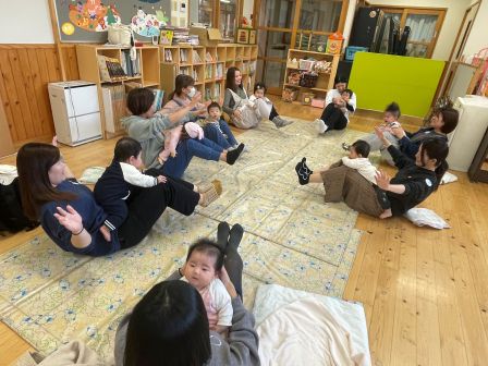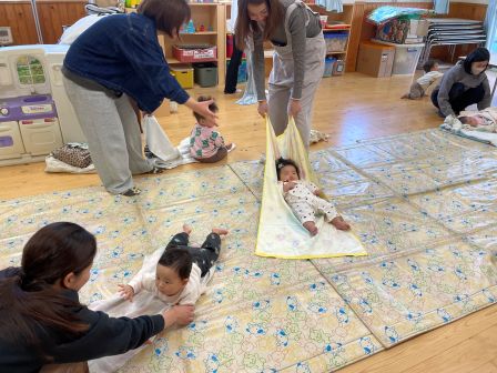 | | | | + ベビーヨガ ☆子育てサークル | | 2025/11/05 |  | 今回はベビーヨガをしました。外部講師の滝川先生をお招きして楽しい時間を過ごしました。(*^▽^*) お母さんに優しくマッサージしてもらうと、みんなとても気持ちよさそうでした。バスタオルあそびではバスタオルに乗って色々な動きをしました。バスタオルに乗って動かしてもらうとみんなとても楽しそう!バランスも上手にとっていましたよ。お母さんたちもスポーツジムに来たみたいに体を動かして頑張りましたね(^^♪
