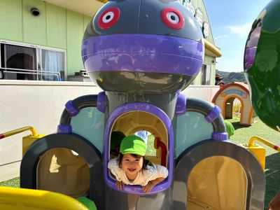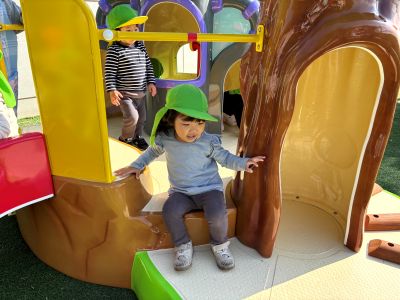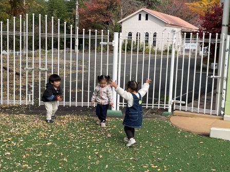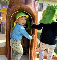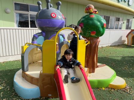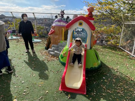 | | | | + 戸外あそび ☆子育てサークル | | 2025/11/19 |  | 今回は戸外あそびをしました。天気も良かったので青空の下、みんなのびのびと遊んでいましたよ(*^-^*)アンパンマン遊具で遊んで、電車を見て、空を見上げてヘリコプターを見つけて、お友だちと一緒に葉っぱをふわ〜っと散らして、シャボン玉をおいかけて、葉っぱのお店屋さんをして、園のお友だちと一緒に遊んで…。いっぱいいっぱい遊んだね(*^-^*)