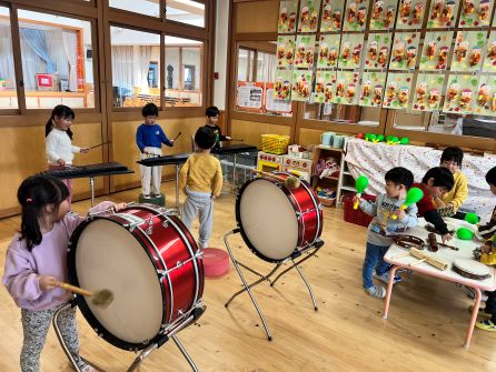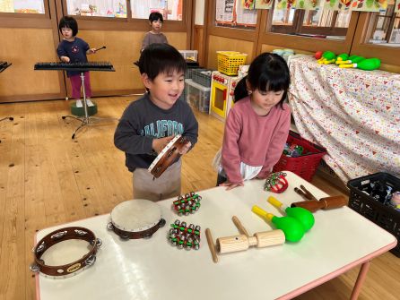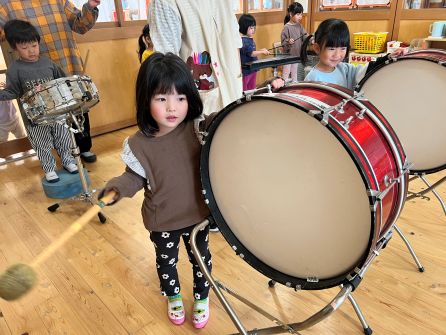 | | | | + うさぎ☆楽器あそびをしたよ!! | | 2025/11/19 |  | みんなで楽器あそびをしました。 去年までなかった大太鼓や木琴、小太鼓があり子どもたち興味津々でした(^^♪ さんぽの曲に合わせてリズムを上手に取る子もいたり、たたき方が分からず先生に教えてもらってたたいてみたりする姿がありましたよ☆ 大太鼓の音を聞いたとき「めっちゃおおきいおと!!」とみんな言って驚いていました(^^)/ 発表会で合奏するので、どの楽器をしたいかを選んでもらいました。そしたら、一番人気なのは木琴でした!!どの楽器になるか楽しみにしていてね!(^^)!
