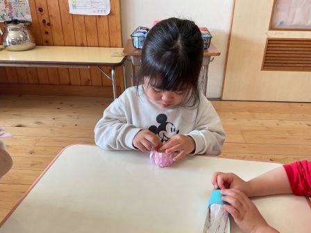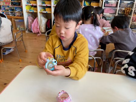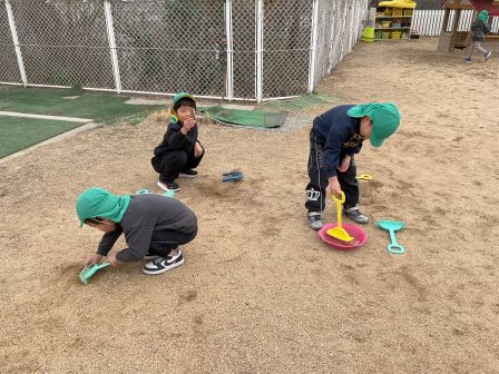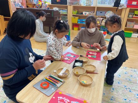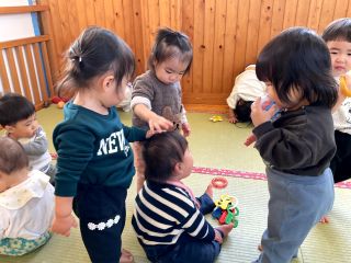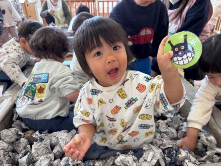 | | | | + お宝ゲット?!★らいおん組 | | 2026/02/12 | | 最近のらいおん組さんの外あそびで、ある事がはやっています。それはお宝集めです! そのお宝の正体とは……園庭に埋まっている石です!石の周りの砂をスコップ等を使って削ったり、時には水を使って地面を柔らかくする工夫をしたり。力を合わせて、大きな石がぼこっと取れるとみんな嬉しそうに見せてくれます。力いっぱい物を叩く時に腕の動きを鍛えたり、どうすれば石が取れるか考えたりあそびの中で色々な力が自然とついてきているのですね(^^)/ H/R | | | | + ひな人形製作 うさぎ組 | | 2026/02/12 | | 今日はひな人形製作をしました。 「今日は何するんだった?」と尋ねると「おひなさま〜」と。 予定をしっかり覚えてくれていました。 今日の製作は初めてする事でしたが、難しそうにしながらも頑張ってしてくれていました。 みんな難しい事でも諦めず頑張ってしている姿を見るととても嬉しいです。 | | | | + 宝ものみ〜っけ☆あひる組 | | 2026/02/09 |  | 「みてみて、あんぱんまーん(*^-^*)」 「こっちにばいきんまんいるよ(*^▽^*)」と子ども達は大興奮!! 新聞紙プールの中にたくさんの宝物があってみんな大はしゃぎで探しました! 大好きなキャラクターを見つけるととっても嬉しそうな表情をしていましたよ☆
