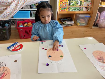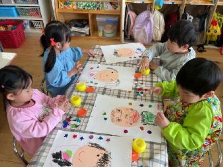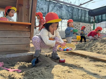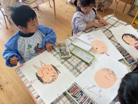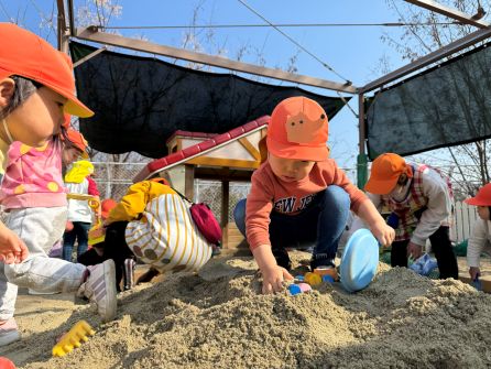 次回は3月4日 クッキング「もちもちパン」です。予約された方のみの参加となります。 美味しいパンを作りましょう! | | | | + 3月製作 うさぎ組 | | 2026/02/24 |  | 今年度最後の月製作をしました。 今回は自分の顔を描きましたが、4月に描いた当番表と比べてみると、どの子もとても上手になっています。 顔のパーツや髪の毛もしっかり描いて、「先生服も描いていい?」と子ども達から聞いてきました。 年度末に持ち帰りますので、ぜひしっかり見て誉めてあげて下さいね。T/R | | | | + 宝探し * りすぐみ | | 2026/02/13 |  | 砂場の砂が、ちょっぴり少なくなってきたので砂を追加し、大きな山ができていました。 新しい砂たっぷりの砂場で一番乗りで遊んだりすぐみさん。こっそりと埋めておいた宝を一生懸命探して遊びましたよ〜(^^)宝物は、みんなの大好きなアンパンマンたち! 大きな砂山に大喜びで、中には宝探しよりも砂山に上るのに夢中になっている子もいました(*’▽’)
