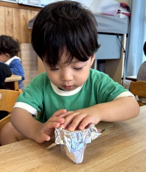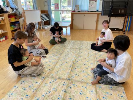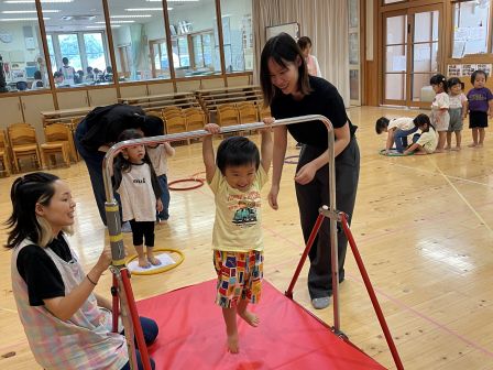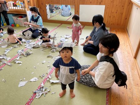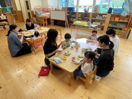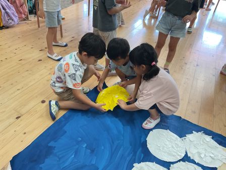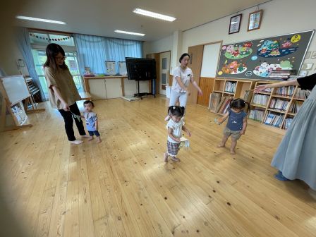 次回は9月17日 手指あそびです。遊びに来てくださいね! | | | + お月見会 | 2025/09/05 | | お月見製作をらいおん、ぞう、うさぎ組で協力してしました。 折り紙をちぎったり、のり付けをしたり、 途中「疲れた〜」と言う子もいましたが、みんなで頑張って完成させることができました。 その後のお月見会では、全クラス集まって、出し物を見たり、うたをうたったりして楽しい時間を過ごしました。T/R | | | + リトミック☆子育てサークル | 2025/09/03 | | 今回はベビーリトミック・リトミックをしました。 ベビーリトミックのお友だちは、お母さんとリズムに合わせて動きました。お母さんの楽しそうなお顔が近づくと、みんなのお顔もニコニコでしたよ(*^-^*) リトミッククラスのお友だちは、ふわふわクラゲになったり、お母さんと一緒にカニさんになって歩いたりしました。上手に歩けましたね♪