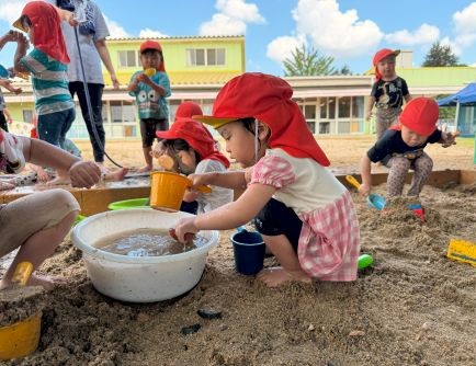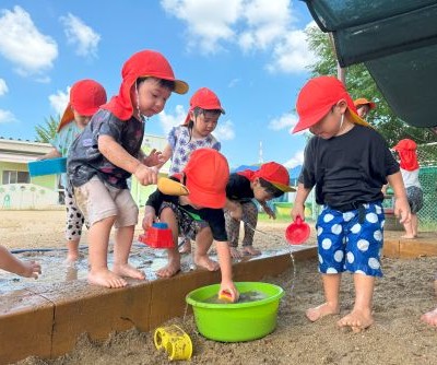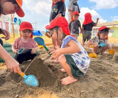 | | | + 泥んこ遊び、楽しいな☆りす組 | 2025/09/12 |  | プールの時期は終わりましたが、まだまだ暑い日が続くのでりす組ではみんなが大好きなどろんこ遊びを楽しんでいます。砂場では全身で思いきり砂や水の感触を楽しんだり、型抜きやお山作りなど、どの子もとても喜んで夢中で遊ぶ姿が見られます。 たくさん遊んだ後はシャワーをしてさっぱりしてから給食を食べてお昼寝です。 しっかり遊んで、たくさん食べて、ぐっすり寝て、毎日元気に過ごしているりす組さんです☆ m・e