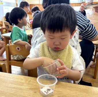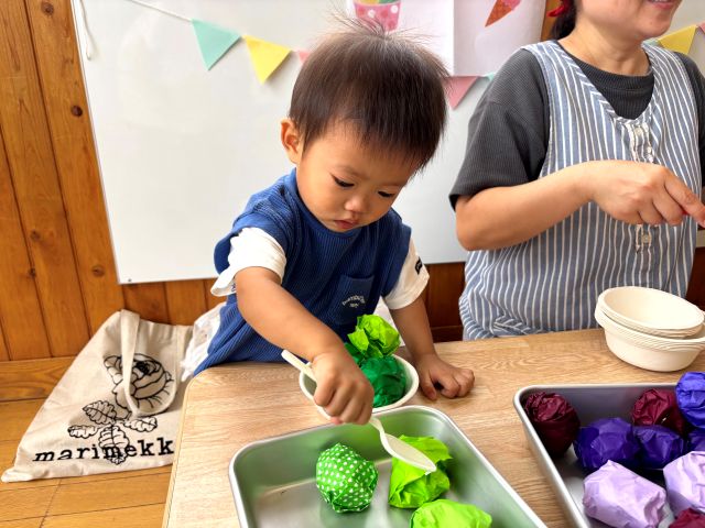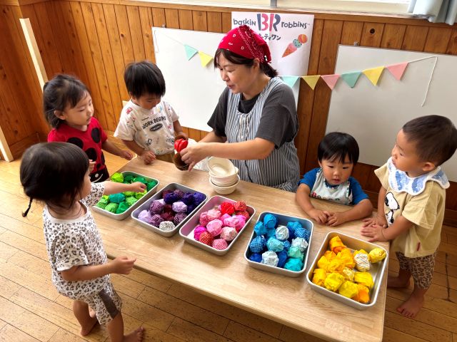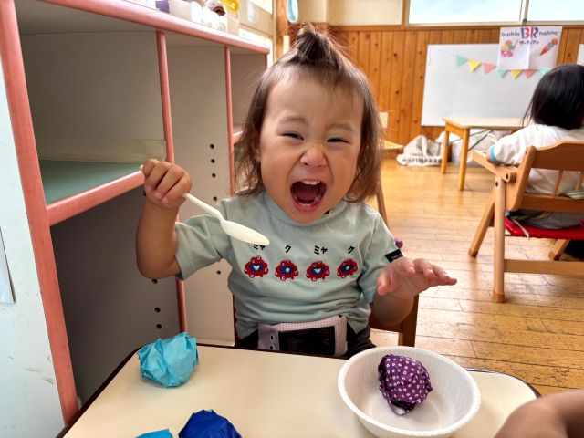 k.m | | | + アイスクリーム屋さんごっこをしたよ★あひるぐみ | 2025/09/12 |  | 先日、あひる組さんでは、アイスクリーム屋さんごっこをしました。カラフルなアイスクリームを選び、カップかコーンかを選びました。美味しそうなアイスクリームを持って、ニコニコなあひる組さんは机まで行き、上手に座って頂きました。大きな口を開けて、パクっと食べて、嬉しそうにする姿がありましたよ。 まだまだ暑い日が続きますが、室内でも様々な遊びをしていきたいと思います。 R.A^-^