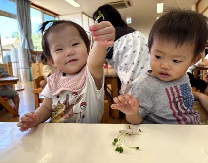+ ☆かいわれ大根の種まき☆ | 2025/09/13 |  | あひる組さんで、かいわれ大根の種まきの食育をしました(*^-^*) かいわれ大根を見せたら、不思議そうに見る子などいましたが、慣れると感触など確かめながら観察をしていました! 1粒1粒カップに種を入れる様子はとても可愛かったです(^-^)♡ 自分で蒔いたのを家に持ち帰って、発芽成長を近くで感じることができたと思います♪ また、みんなで楽しめる食育ができたらとおもいます!!