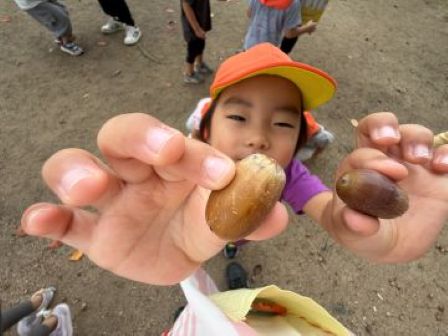 | | | | + どんぐり拾いに行ったよ★りす組 | | 2025/10/15 |  | 少し涼しくなってきて、お散歩にぴったりの季節になりましたね。 久しぶりにお友だちと手を繋いで、公園に行ってきました。 公園に着くと、みんなでどんぐり拾いをしましたよ! 「どんぐり見つけた〜」と大興奮の子どもたち!どんぐりの帽子も見つけて見せてくれましたよ。またお散歩行こうね(o^―^o) s.m | | |