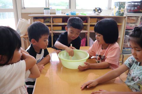 k^y^k | | | | + スライム作りに挑戦!ぞう組 | | 2025/10/15 |  | 今日のテーマはスライム作り!ただスライムを作るだけではなく、良い音がするスライム作りをしました★ 材料を混ぜて…始めはトロトロの液体だったものがいつの間にか伸びて固まって!変化を不思議そうに楽しんでいました(o^―^o)その後は、好きな色を付けたり、ストローを短く切ったものを入れてみたり…とオリジナルのスライムが完成しました! 完成したスライムは、触って感触を楽しむだけでなく、マイクを近づけてみんなで音を聞いてみました!どんな風にさわったら、良い音がなるかな?何か入れたら良い音がするかな?子どもたちなりに考えていました!! 前日から楽しみにしてくれていた子ども達!また、みんなでスライム作りしようね(*^^*)♪