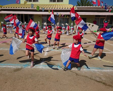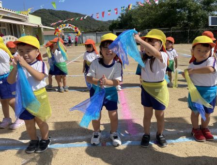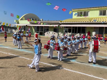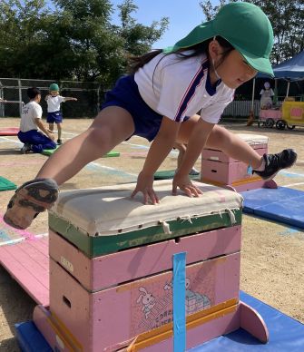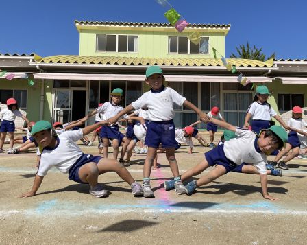 和太鼓はもう一曲プラスして、曲のない『大門太鼓』を披露してくれました。とても長い曲を覚える子どもたちにいつも感心させられます。覚える秘訣はリズムを言葉にする事。「たこ焼き一つ、おいしいチャーシュー麺」などリズムに合った言葉を子どもたちと考えて楽しく覚えています。 逆上がりや跳び箱も何度も練習しました。外でも部屋の中でも「跳べるようになりたい!!」と頑張っていましたよ。 砂が沢山ついても、足が痛くても、手や足を伸ばして一致団結した組体操。 重い太鼓を一生懸命持って叩いた鼓笛隊。 みんなでバトンを繋いだ親子リレー。 どの競技も素晴らしかったです。 みんなよく頑張りました。