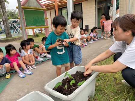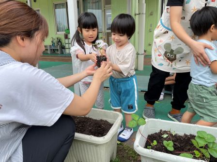 o.k | | | | + 畑始めました★ | | 2025/10/20 |  | とってもかわいい畑に、小松菜とそら豆を植えました。 小松菜は、1週間前に植えて、早速、芽がたくさん出ました♪1ヶ月ぐらいで収穫できる予定なので、ぜひ観察してみてください! 隣のじゃがいもも、順調に大きくなっていますよ♪ プランターには、いちごを植えたので、それぞれ子どもたちと大きく育つように、水やり、観察をして、春を待ちたいと思います(*^^)v ぜひ、登降園の際、畑を見てください(^O^) | | | | + がんばった運動会A | | 2025/10/16 |  | 保育園生活最後の運動会!! さすがらいおん組さん★