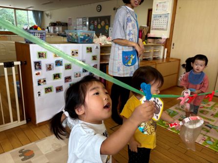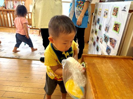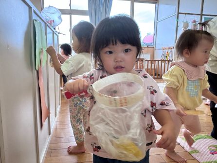 次回は11月5日 ベビーヨガです。0歳児、1歳児位のお子さん対象です。外部講師を招いて行います。活動後子育て相談もできます。要予約となりますので詳細はHPをご覧ください。 | | | | + 虫取りごっこ★あひる組 | | 2025/10/22 |  | お部屋の中で虫取りごっこをしました。 色んな虫がいてみんな大はしゃぎ!! 早速、虫取り網を持って「えい!えい!」と捕まえていました。 木にとまっているカブト虫やセミを上手に網で捕まえたり ひらひら飛んでいるちょうちょやとんぼを手を伸ばして捕まえている子もいましたよ。 お外で遊んでいる時も、本物の虫探しに夢中です。