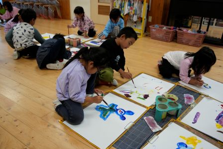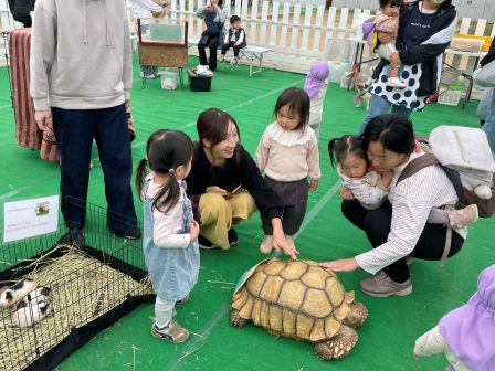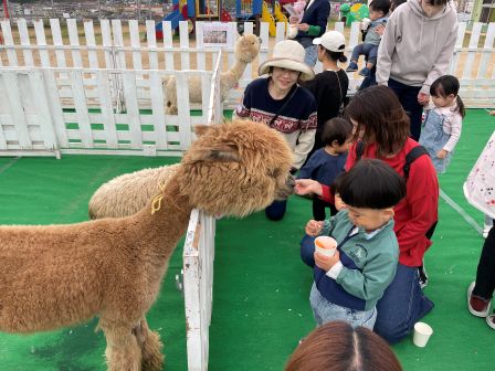| + そら豆育てるぞ!!ぞう組 | | 2025/10/28 |  | 園にできた新しい畑にそら豆を植えました!給食の先生に、そら豆の黒い部分(おはぐろ)を下にして植えるんだよ!と教えてもらい、子どもたちもしっかり種をみて向きを確認していました!今回は二人で一つの種だったのですが、二人で一緒に種を持ったり、土に植える人、種を持つ人…と子ども同士で役割を決めている子もいました! 当番活動で、水やりも行いながらそら豆の生長を見守っていこうと思います(^^♪ たくさん収穫できますように🌠 f.n | | | | + 芸術の秋🍂★らいおん組 | | 2025/10/24 |  | いつもはクレパスや色鉛筆を使って絵を描いているらいおん組さん。今回は絵の具を使って自由に絵を描いてみました。 筆の持ち方や太さの違い、絵の具がパレットの中で混ざらないようにする使い方を最初に伝えると聞いた事をしっかり守ってお絵描きを楽しむ事ができました。イメージした物を描いたり、色の混ざりあいを楽しんだり。床や服に絵の具が飛び散らないように丁寧に使っている姿や、筆を使って色々な細かい表現ができるようになっている姿に成長を感じました( ´艸`) H/R | | | | + 移動動物園 ☆子育てサークル | | 2025/10/23 |  | 今回は移動動物園が園にやってきたので、サークルのお友だちも行ってみました。アルパカ、ウサギ、亀、モルモット…その他たくさんの可愛い動物と会えました(^^♪みんなちょっぴり怖かったようですが、そーっと触ってみたり、抱っこしたりしていましたよ。アルパカさんにニンジンのごはんもあげられたね。とても楽しい触れ合いの時間でした。