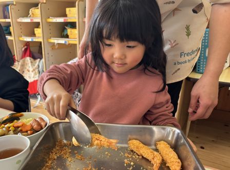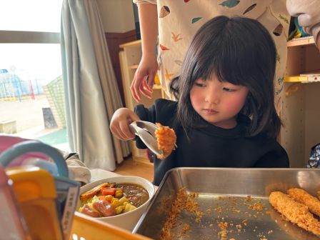 先日の食育でトングの使い方を練習したうさぎ組さん。 早速、エビフライに挑戦しました。 トングの持ち方や向きを思い出しながら 上手にカレーの上にのせることができました。 自分でトッピングしたエビフライは特別なようで エビフライから食べ始める子が多く見られました。