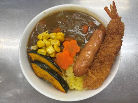 〈メニュー〉 〇ターメリックライス 〇カレー <トッピング> ・エビフライ ・ウインナー ・コーン ・ベイクドかぼちゃ ・花型にんじん 〇ゼリー