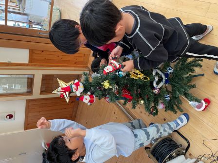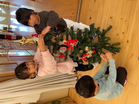 | | | | + クリスマスツリーを飾ったよ♪ | | 2025/12/01 |  | 早いもので今年も残り1ヶ月ですね! 今月は子どもたちの楽しみにしているクリスマスが待っています★ サンタさんを迎え入れるために、クリスマスツリーを飾りました! らいおんぐみの子どもたちに飾り付けをお願いすると、 目を輝かせながらオーナメントを飾っていました(^^♪ サンタさ〜ん!!待ってるね〜〜♪♪ s.s | | | | + 戸外あそびが大好き★あひるぐみ | | 2025/11/28 |  | 「外に行くよ〜」と声をかけると大喜びのあひる組さんです!秋ならではの紅葉している葉っぱを見つけて葉っぱに穴をあけてそこから覗いてみたり、葉っぱを上からひらひらさせてみたりどんぐりを見つけたりして楽しんでいます。 これからもたくさん外あそびをして風邪に負けない強い身体を作っていこうね!! n.m | | | | + 11月 お楽しみ献立 | | 2025/11/27 |  | 11月 お楽しみ献立