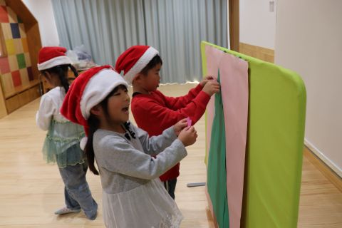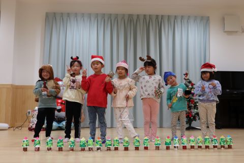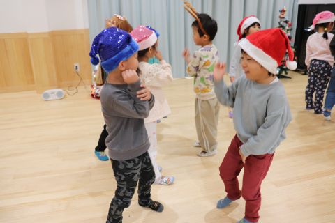 | | | | + クリスマスパーティー☆ぞう組 | | 2025/12/08 |  | みんなでクリスマスパーティーをしました!かわいいサンタさんや、トナカイに変身し、クリスマスの曲に合わせて演奏会をしたり、クリスマスにちなんだゲームをしました☆ 演奏会では、好きな楽器を選んで、曲に合わせ自由にリズムを叩いてみたり、素敵な音楽ができました♪ゲームでは、じゃんけんをたくさん取り入れたものだったのですが、子どもたちの白熱した戦いが見られました! 12月に入ったばかりですが、サンタさんが待ち遠しい子どもたちです(*^-^*)サンタさんがきてくれますように!