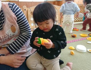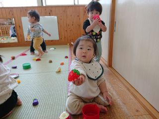 次回は2月4日 ベビーリトミック・リトミックです。クラスにより受付時間が異なりますので、ホームページでご確認お願いします。音楽に合わせて動いて楽しみましょう♪ | | | | + 先生とお話楽しいな! | | 2026/01/27 | | 1月になり、先生とやりとりができるようになってきました。 ままごとでは先生にお料理を作って渡してくれたり、コップを持って一緒に乾杯したりと、楽しんでいます。以前は一人あそびが中心だったひよこ組さんもやりとりする姿が増えてきて成長を感じました。みんなで楽しく遊ぼうね! Ⅿ、A