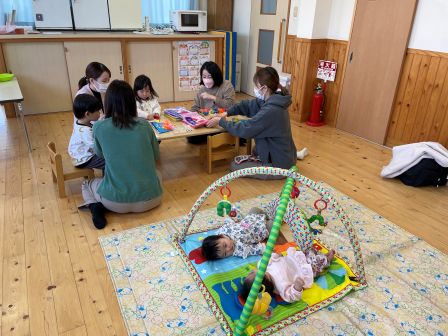 | | | | + しめ縄を作ったよ☆りすぐみ | | 2026/01/08 |  | 新しい年を迎えるためにみんなでしめ縄を作りました。 歯ブラシに絵の具をつけて縄の部分に色をつけたり、馬のたてがみをハサミで切ったり、しめ縄に千代紙を貼り付けたりと、それぞれにかわいいしめ縄ができました♪ 2026年もみんなで元気に楽しく過ごしていきたいと思います。 m・e | | | | + わらべうたベビーマッサージ・正月☆子育てサークル | | 2026/01/07 |  | 今回はわらべうたベビーマッサージ・お正月あそびをしました。 わらべうたベビーマッサージは、わらべうたの歌に合わせてお母さんの優しい手のぬくもりを感じながらおこないました。親子で癒される時間でしたね(*^-^*) お正月あそびは手作りコマで遊びました。自分で回したり、回るコマを見つめたりして楽しみました。