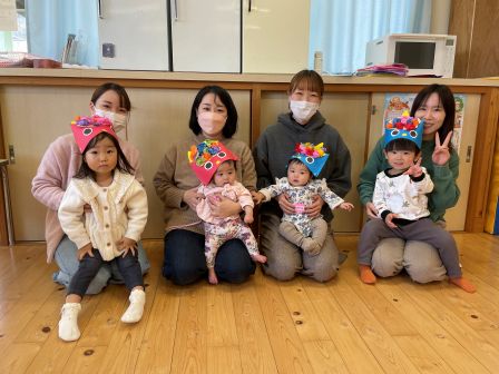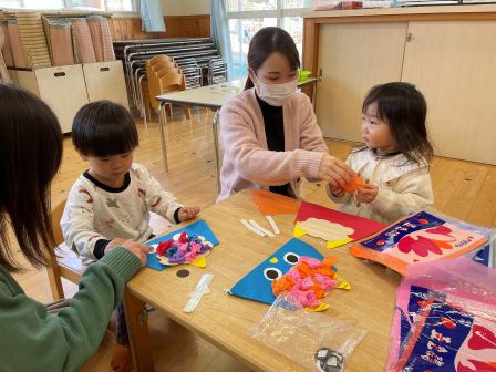 k.m | | | | + 製作「節分」☆子育てサークル | | 2026/01/28 |  | 今回は製作「節分」をしました。フラワー紙を丸めて髪の毛にしたり、目や鼻を貼ったりして作りました。小さなお友だちはお母さんに作って頂きましたが、自分で出来るお友だちは色を選んだり、貼る場所を考えたりしながら可愛いい鬼の帽子が出来ましたよ(*^_^*)