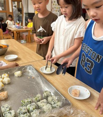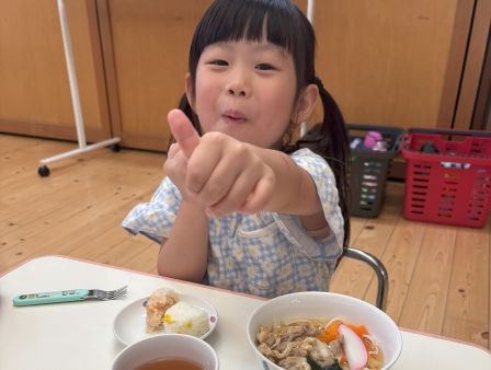 m.r | | | + 8月★お楽しみ献立 | 2025/08/29 |  | 8月のお楽しみメニューは *おにぎり (じゃこ菜飯・とうもろこしごはん・鮭ご飯) *肉うどん *冷凍みかん でした(^^)/ うさぎ・ぞう・らいおん組さんは3種類の中から2種類を自分たちで選びました♪ どれにしようか悩みながら、選んでいましたよ(^O^) 1番人気は【鮭ごはん】でした☆彡 みんな、とてもおいしいとおかわりもよく食べてくれました(*'▽')