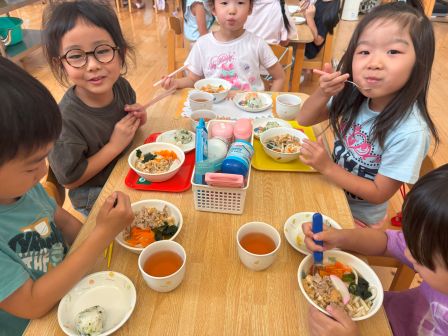 次回は9月10日 クラスあそび・給食試食会です。クラスに入って園のお友だちと一緒に遊びましょう。その後は給食試食会です。予約された方のみの参加となりますのでご了承ください。