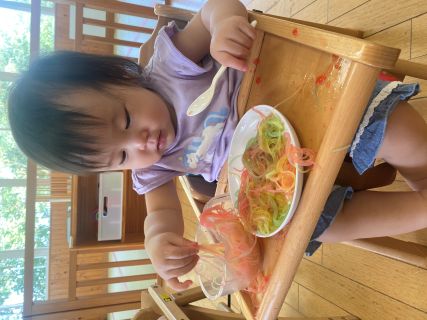 今年の夏は寒天、氷、泥など 様々な感触あそびを経験し 少しずつ様々な物に触れることに興味を持てるように なってきました!! 感触あそびは五感を刺激し、好奇心と挑戦力の育成 細かい筋肉の発達を促してくれます♪ これからも様々な感触あそびに挑戦していけたらいいなと 思っています(^^)/