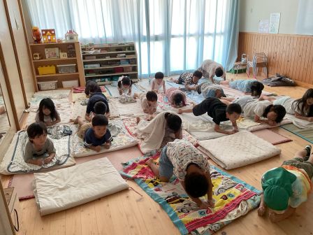 | | | + プランク大会!★らいおん組 | 2025/08/30 | | 最近、らいおん組では運動会の体育発表や組体操に向けて、寝る前のプランク大会を開催しています。 プランクをする事で腕やお腹の力が鍛えらえたり、体幹も強くなったりします。子どもたちも「今日は30秒したい!」「もっと力をためなきゃ!」とやる気になって取り組んでいます!数か月後にはムキムキになってるかもしれませんね(*^^*) H/R | | | + 感触あそびをしました☆ひよこぐみ☆ | 2025/08/30 |  | 上のクラスのスイカ割りを見学した後 スイカに見立てたゼリーや 色付けされたはるさめで遊びました♪ プルプル揺れるゼリーを見て指でつついてみたり 大胆に握りつぶしてみたり はるさめを摘んで違う容器に移し替えたりしながら 楽しんで遊んでいましたよ!!