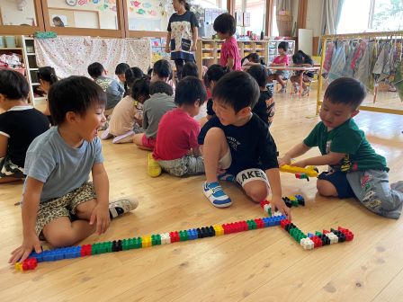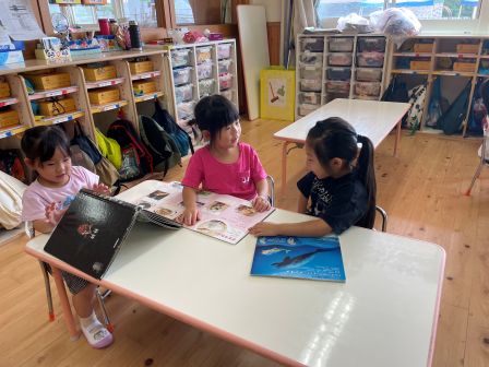 k^y^k | | | | + 自由あそび うさぎ組 | | 2025/10/06 | | 今にも楽しいおしゃべりが聞こえてきそうですよね〜 お友達と一緒におしゃべりをしながら、どの子もニコニコであそびを楽しんでいます。 ブロックなどではお互いの作った物を見せ合ったり、1冊の絵本を一緒に見たりすることも。 これからも仲良くあそべるように子ども達の関わりを見守っていきますね。t.r