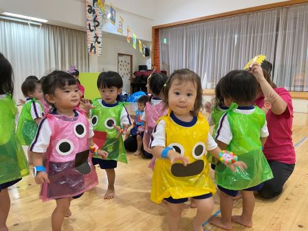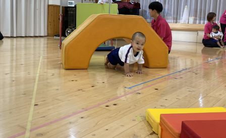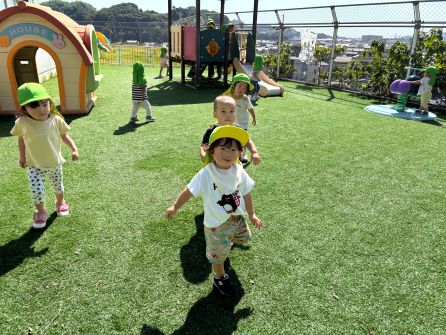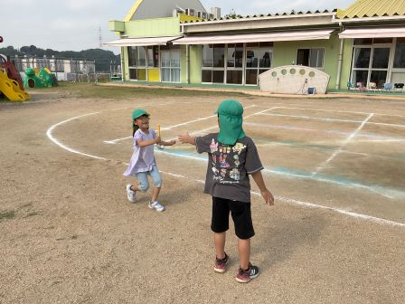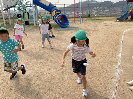 o.k | | | | + お玉リレーに挑戦だ★らいおん組 | | 2025/10/14 |  | 先日行われた運動会の親子競技でリレーをしたらいおん組さん。子どもはバトンを持って走るのですが、お家の方はピンポン玉をお玉に乗せて走ります。慎重に走っているお家の方を見て「もっと早く走って!」と応援していた子ども達、なんでゆっくり走っているのか疑問に思った子もいたようなので、みんなも挑戦してみました☆ 実際にやってみると、バランスを取りながらビュンビュン走っていてびっくりしました。最初はコーナーを曲がる時にピンポン玉を落としてしまう子がいたのですが、くり返していくうちにお玉の持ち方や姿勢、曲がるスピード等のコツを自然とつかんでいました。理屈ではなく、感覚で理解していく子どもたち、実際に経験する事はとっても大切ですね(^^)/ H/R | | | | + 0,1歳運動会 | | 2025/10/09 |  | 4日(土)に0,1歳の運動会がありました。 天気は雨でしたが、沢山の方が見に来て下さいました。 かけっこや踊り、親子競技など、子どもたちの普段の様子を見てもらうことが出来ましたよ。 恥ずかしくて涙も出ましたが、どの子も頑張って輝いていましたよ♪ 11日(土)は2〜5歳児の運動会です。 今週は天気も良く、暑い中練習を頑張っていますよ。 楽しみにしていてくださいね。