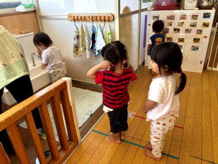 | + がんばっていること★あひる組 | | 2025/10/15 |  | 少しずつ涼しくなってきましたね。 お外あそびが大好きなみんなは大喜びで帽子を被ったり 靴を履くことにも挑戦しています。 うまく履けた時には笑顔で知らせてくれる子ももいますよ。 たくさんお外で遊んだ後はお部屋に戻ってきれいに手洗い! 床に貼ったイラストの上にきちんと立って順番を守れるようにもなってきました。 毎日の積み重ねをこれからも大切にしていきたいとおもいます☆