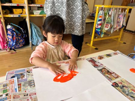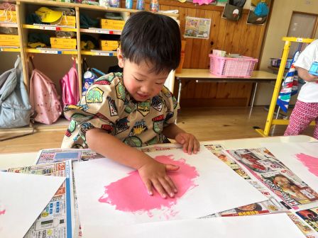 R.A^-^ | | | + ゆびえのぐで製作 うさぎ組 | 2025/06/09 |  | ゆびえのぐを使って製作をしました。 前日に「明日はゆびえのぐを使って製作をするよ〜」と話をしていたので、「今日は何するかな?」と尋ねると「ゆびえのぐ!!」と。みんなちゃんと覚えてくれていました。 画用紙に絵の具をだして、それをグルグルグルと。 みんなとっても楽しいようでずっとニコニコしながらしてくれていました。 しっかり感触を味わえたようでよかったです。 T/R | | |