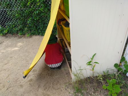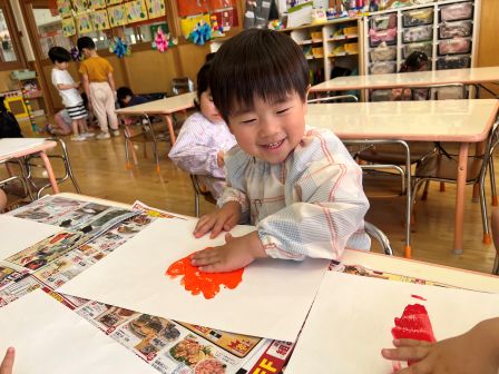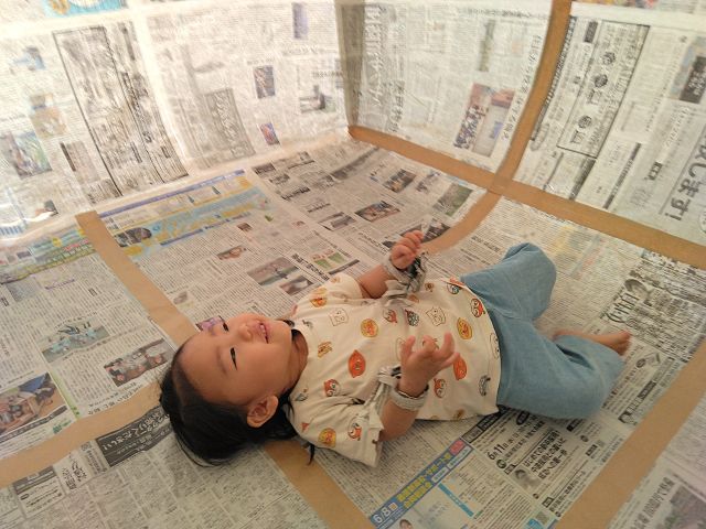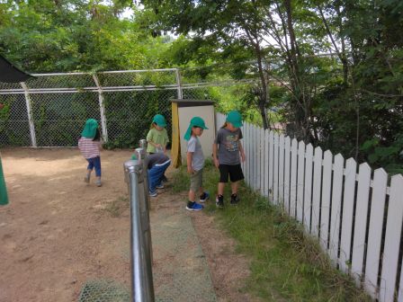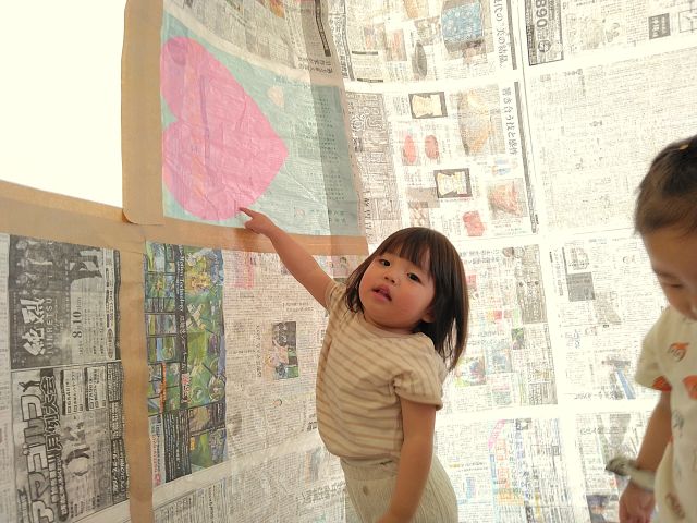 | | | + 虫探しにむちゅう〜★らいおん組 | 2025/06/10 |  | 最近、らいおん組さんの中で虫探しがブームになっています。 草が生えている所や、玩具置き場の下の暗い所、陰になっている所など虫がいそうな場所を練り歩いてどんな虫がいるかな〜と探していきます。見つかる虫は様々で、バッタやダンゴムシ、カミキリムシと捕まえた虫を嬉しそうに見せてくれます。虫を捕まえる事で指先の使い方を身に付けたり、命を扱う事について学んだりする事ができます。季節によってどんな虫が見つかるか楽しみですね♪ H/R | | | + しんぶんしのおうちだ〜★あひるぐみ | 2025/06/10 |  | 先日、あひるぐみさんでは新聞紙あそびをしました☆彡 指先を使ってちぎったり丸めたり、とっても上手に遊んでいました! また、新聞紙で作ったおうちに扇風機を近づけると、、、 とっても大きな新聞紙ドームが完成★!! 中に入って、とっても楽しそうなあひるぐみさんでした。