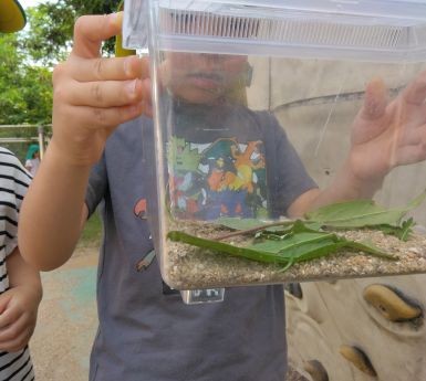 f.n | | | + ダンゴムシの観察 りす組 | 2025/06/13 |  | ダンゴムシの絵本を読んでから、ダンゴムシに興味津々のりす組さん。 ダンゴムシの観察をしたのですが「ダンゴムシは葉っぱをたべるよね」「びっくりしてまるくなってるね」など絵本の内容をよく覚えていて、ダンゴムシの様子を見ながら優しく触ったり、「ごはんだよ」と葉っぱを持ってきてダンゴムシの近くに置いたりとダンゴムシとの触れ合いを楽しんでいました。 生き物との触れ合いを通して命の大切さを知らせていきたいと思ってます。 M.E