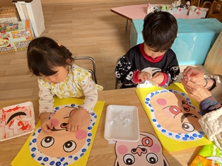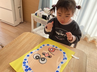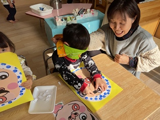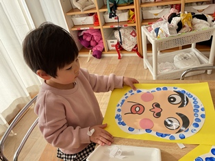 2026/01/17 ひょっとこ 製作でひょっとこの福笑いをしました!ポンポンと模様をつけたり顔のパーツを貼る時は目を隠せる子は隠して貼ってみたりとお正月の遊びを取り入れてしましたよ!眉毛をおひげにしていたり好きな向きでパーツを貼っていたりととっても面白い顔が完成していましたよ🤣