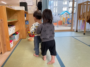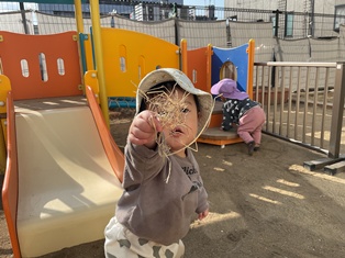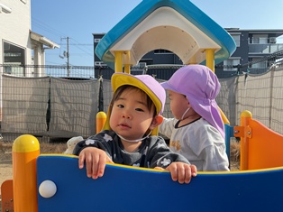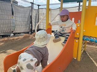 2026/01/28 冬だけど、ポッカポカ 今日は暖かい日差しが園庭に差し込んでいて…ひよこ組の皆も遊具に集ってあそんだよ☆滑り台も階段も先生に見守られながら一人でよいしょ♪先生に芝を「どうぞ」と持ってきてくれるお友だちも(笑)