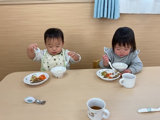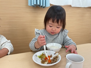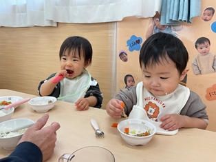 2026/01/28 フォーク持って食べてるよ ひよこ組さんも少しずつフォークを持って自分ですくって食べることを頑張っています!手伝ってしまいたい気持ちをぐっとこらえて見守っていますよ✨少しでもお口に入ると満面の笑みで「できたよ」と先生とアイコンタクト👀お姉ちゃんお兄ちゃんになっている瞬間です!