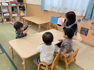 2026/01/28 絵本タイム 先生にお誕生日の絵本を読んでもらったよ!いろんな動物が出てきて先生の声をまねて鳴きまねしたり、拍手を一緒にしたり…ほのぼのした絵本タイムでした!