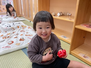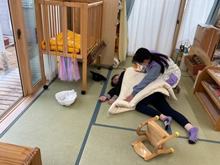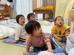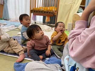 お昼寝前のひよこ組の部屋を覗いてみると…
