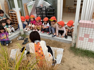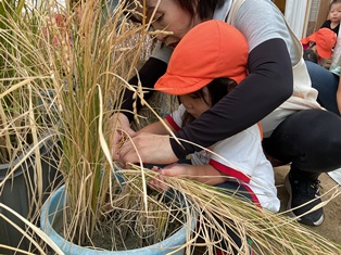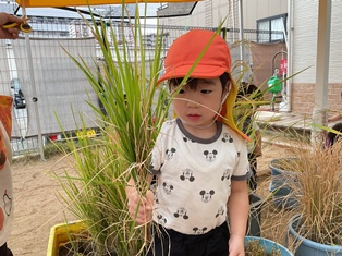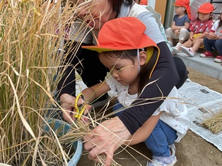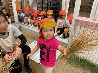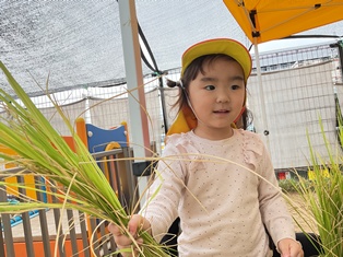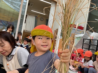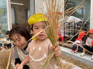 2025/10/16 稲刈りをしたよ!! 園庭の稲穂が大きく育ってきたので稲刈りをしました(^▽^)/先生と一緒にハサミを持ってチョッキン…チョッキン…と切っていきましたよ✂🌾上手に切った稲を持って見せてくれました😄