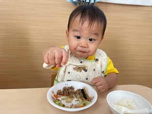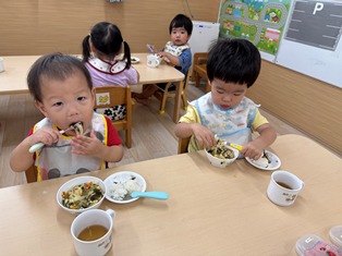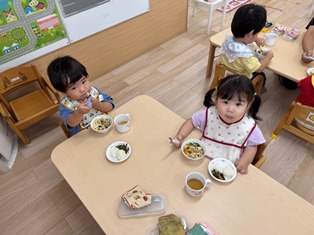 2025/10/14 もぐもぐ 最近のあひる組さんの様子です!以前よりも食具を上手に持って食べることができるようになりました!☆彡食べこぼしも少なくなってきました!すごいですね♪