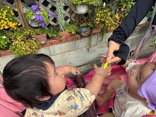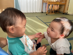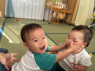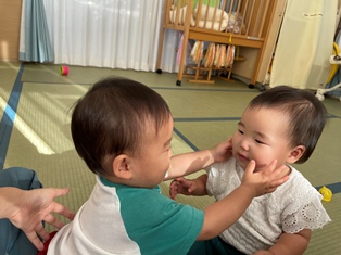 2025/10/15 触ってみたいな 仲良しなひよこ組さんのおともだち2人…いつも先生がお友だちの名前を呼びながらほっぺをやさしく触っている様子を見て「触ってみたいな💗」と近くにやってきましたよ!先生の真似っこしながらとっても優しくほっぺにペタ💗💗してもらったお友だちも嬉しくて両手をぶんぶんっと回していましたよ♪
