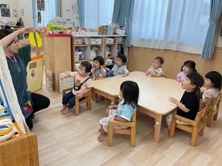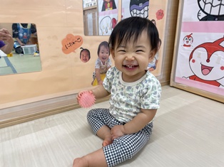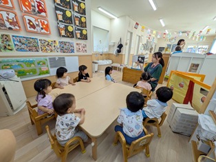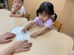 2025/10/01 1 お化けを作ろう! 運動会で使うおばけをみんなで作りました!両面テープをはがすお手伝いをしてもらい・・・!どんどんおばけになってくると怖くて顔を隠しているお友だちもいましたが最後はできたお化けによしよしやタッチしてバイバイをしました!