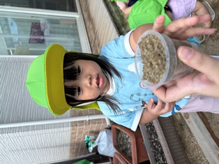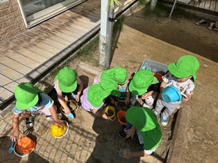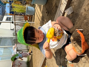 2025/10/01 1 砂場あそび 久しぶりに戸外に出ました!最近は過ごしやすい気温になってきましたね(^▽^)/砂場遊びを楽しみました久しぶりの砂場やスコップ、バケツにテンションがMAX!見立てあそびも上手に行っていましたよ!お腹がいっぱいになるぐらいの砂のケーキを作ってもらいました!