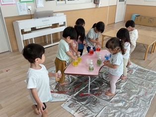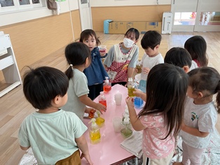 2025/10/01 色水あそび 赤色、青色、緑色、黄色の4色で色水あそびをしました!!ボトルやカップの中に色水の入ったポンプを何度もプッシュして色水をたくさん出していましたよ(^▽^)/赤色と黄色を混ぜてオレンジ色になると「オレンジジュース!!」🍊赤色と青色を混ぜてむらさき色になると「ぶどうゼリー!!」🍇と見せてくれていました😆