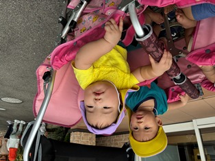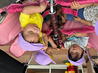 2025/10/02 散歩にレッツゴー! 全クラスで散歩に行きましたよ!ひよこ組さんもバギーカーに乗って後をついて行ったよ🌟途中ショベルカーを見つけると身を乗り出す勢いで釘付けになっていたお友だちも☺保育園に戻ってくるとニッコリこの笑顔(^▽^)/
