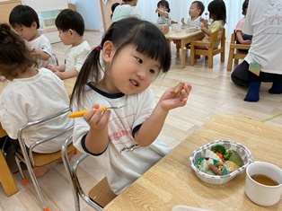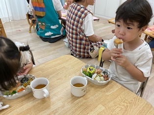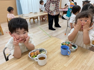 2025/10/03 おべんとう♪ 運動会ごっこ後…お弁当給食だったよ(^▽^)/「タコさんウインナー!!」などとお弁当を見て嬉しそうな子どもたち😆アンパンマンの飾りもついていて興味津々でした!パクパクとあっという間に食べましたよ😋🥄とっても美味しかったです!!給食先生ありがとう💖