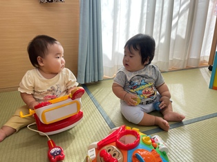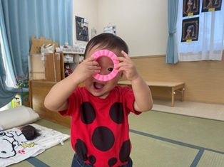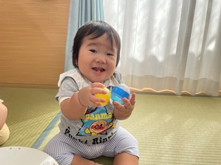 2025/09/30 ガラガラ音がするね 朝の自由あそび友達がしている遊びにも興味があってお互いちらちら気にしながら遊んで…♡ガラガラ音のするカプセルを穴の中に落とすと、反対から転がって出てくるのに気が付いたお友だちは何回も転がして遊んでいたよ♪カプセルを二つ叩くと音が大きくなって楽しいね🌟