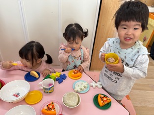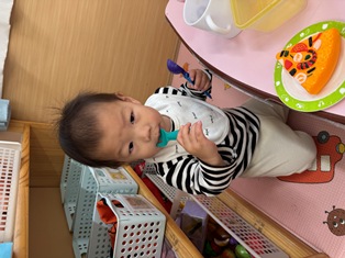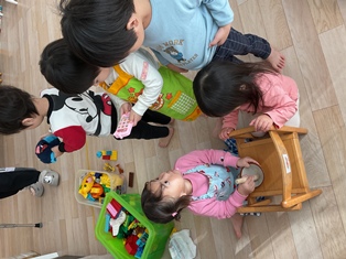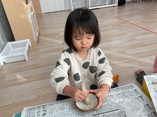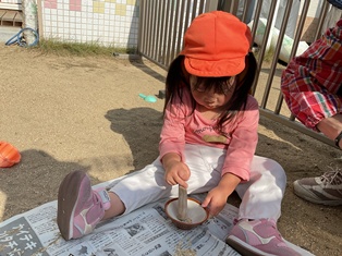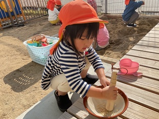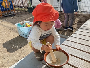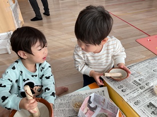 もみ殻を取るためにすりこぎとすり鉢を使って