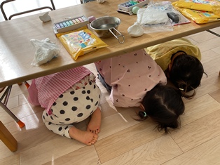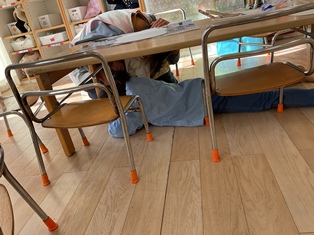 「机の下に隠れるよ~」と