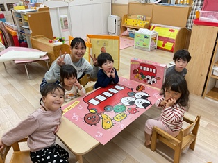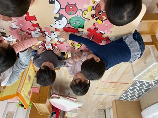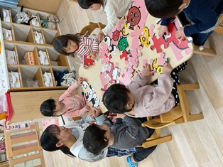 2025/12/03 大きなパズル お迎えの時間でとっても大きなパズルに挑戦したりす組さん🧩「おべんとうバス」のパズルで出てくると興味津々!!「おにぎりかなぁ~??」などとみんなで考えながら組み合わせていきましたよ🤔パズルをいろんな向きにしてみて黙々と集中していました!!しばらくすると完成していましたよ✨すご~いね(^^♪机の大きさと同じだね(*^▽^*)